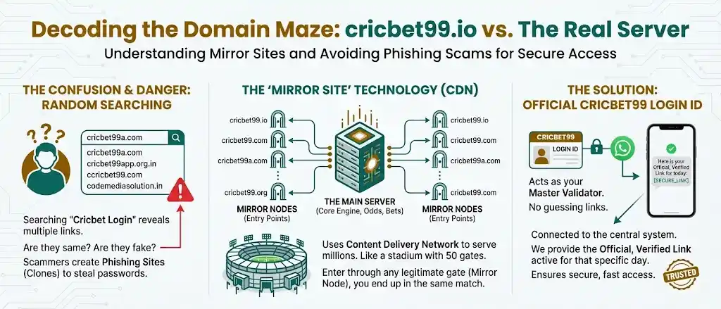 - The Mirror Nodes: These are the links you see (cricbet99.com, cricbet99.io). They are entry points.
