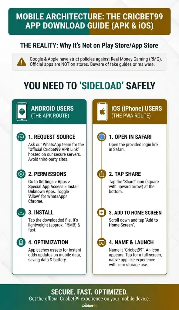 The Reality: Google and Apple have strict policies against Real Money Gaming (RMG) apps in certain regions. You will never find the official app on the Play Store. If you see one (often advertised on sites like cricbet99app.org.in), it is likely a fake guide app, a redirect tool, or malware.