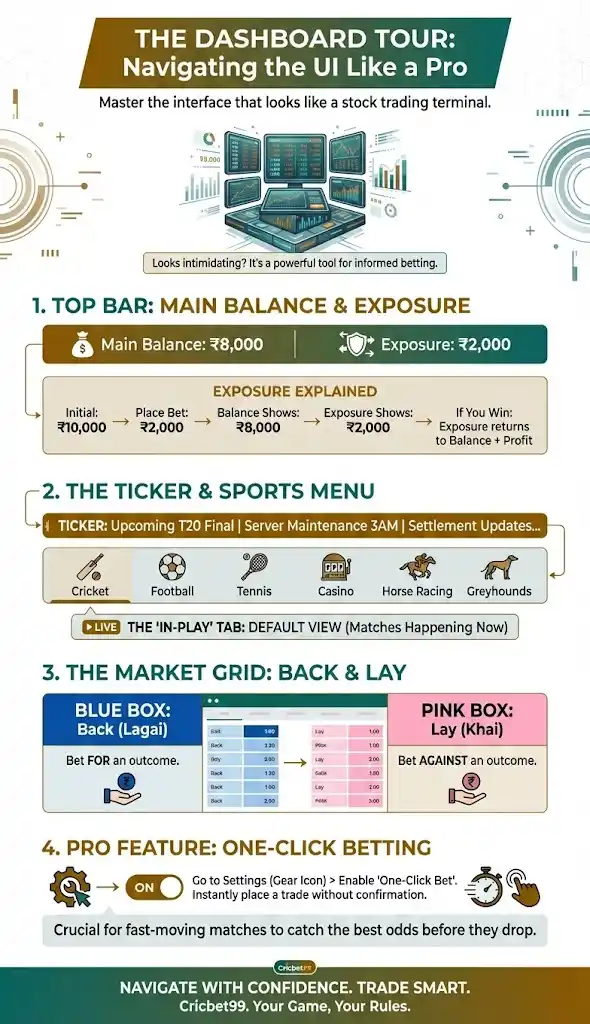 - Exposure Explained: If you have ₹10,000 and place a ₹2,000 bet, your Balance shows ₹8,000 and Exposure shows ₹2,000. If you win, the Exposure returns to the balance plus profit.