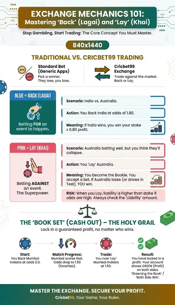 In a standard bet (like generic apps), you pick a winner. If they lose, you lose. In Cricbet99, you trade against the market.