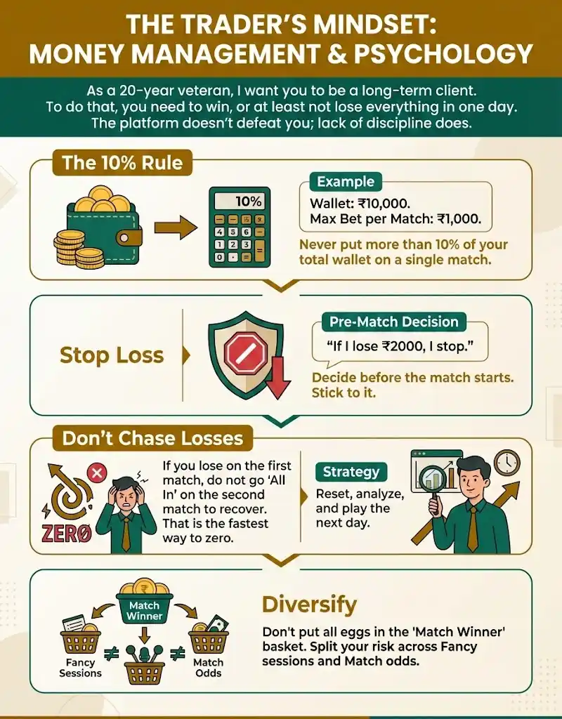 Diversify: Don’t put all eggs in the “Match Winner” basket. Split your risk across Fancy sessions and Match odds
